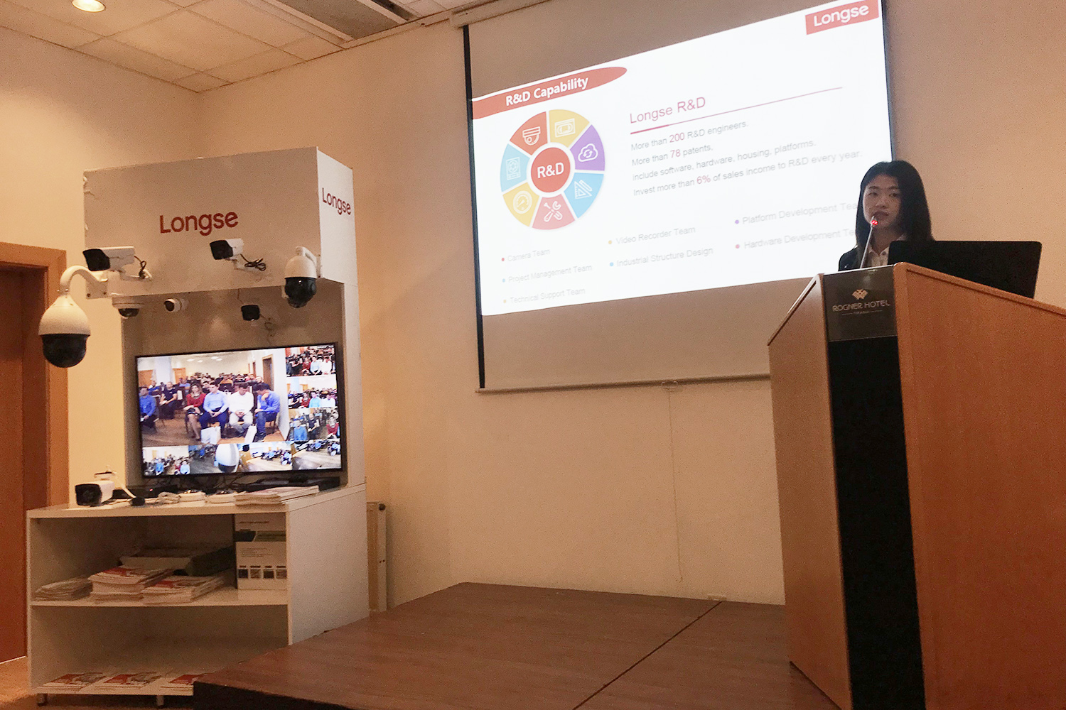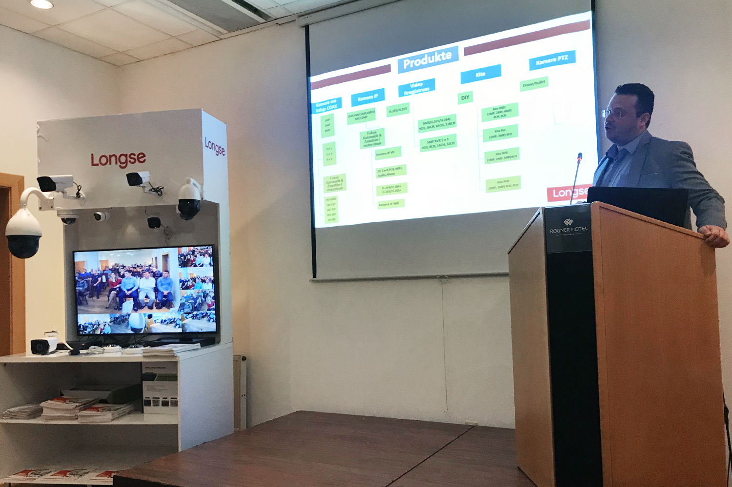 產(chǎn)品發(fā)布由長視科技2018阿爾巴尼亞代理開篇,垂直市場銷售工程師Ermal Sallaku為大家進(jìn)行了詳細(xì)解讀,重點(diǎn)介紹了PT球系列(PT5A、PT7E系列)、DIY套裝(Kits)、NVR系列、網(wǎng)絡(luò)高清系列(LBB60/90系列)、同軸高清系列(LBN24、LVWDC20系列)等明星級(jí)產(chǎn)品以及安防行業(yè)的前沿技術(shù)。在發(fā)布會(huì)過程中,展臺(tái)中的明星級(jí)攝像機(jī)發(fā)揮渾身解數(shù),在現(xiàn)場透過熒屏呈現(xiàn)高清盛宴,還原了會(huì)場燈光、顏色、人臉等細(xì)節(jié),讓與會(huì)合作伙伴深度及直觀地享受和了解2018年的最新產(chǎn)品與效果。