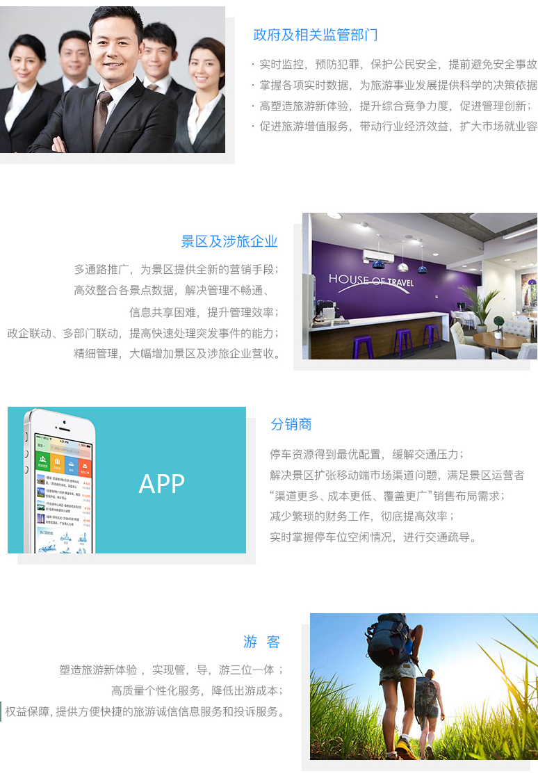 依托景區(qū)大數(shù)據(jù)分析提供增值服務(wù),為景區(qū)管理者制定發(fā)展策略,提供有效的數(shù)據(jù)支撐;幫助景區(qū)邁入智慧管理時(shí)代,為景區(qū)、為游客省心、省時(shí)、省力、省事又省錢!